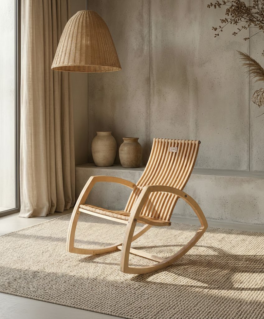 The Davis Chair is a contemporary reimagining of the classic rocking chair. Crafted from durable plywood with a precision-cut slatted design, it offers a soothing rocking motion and modern aesthetics.