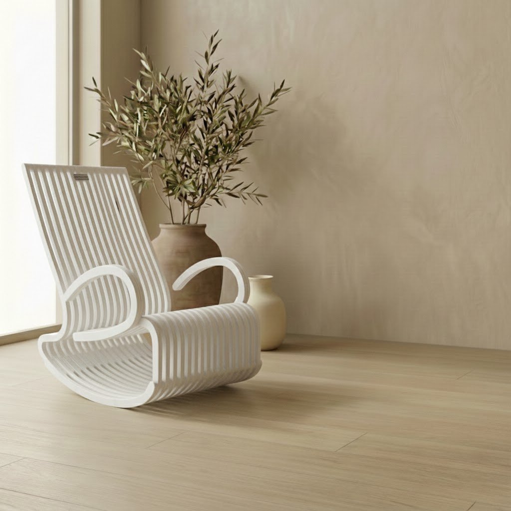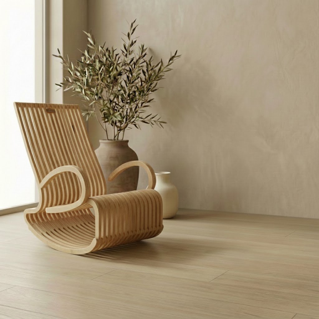 The Warber Rocking Chair stands out as the most intricate piece in our collection. By utilizing 107 precision-cut wooden layers, the Warber achieves a level of curvature and detail that standard furniture cannot match. The sheer density of the slats creates a surface that feels almost solid yet visually permeable and light.